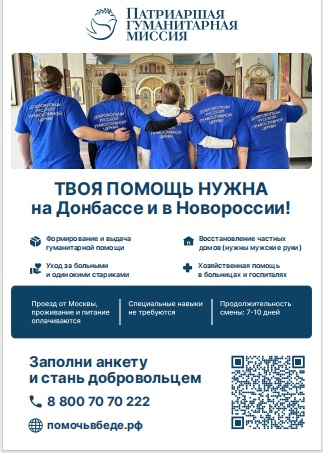 По благословению благочинного о. Иоанна Осяка, по Юго-Западному благочинию, всем желающим добровольцам поучаствовать в гуманитарной Патриаршей миссии обращаться по телефону: +7 928 905-95-15 к Ирине Сариевой, помощнику благочинного.